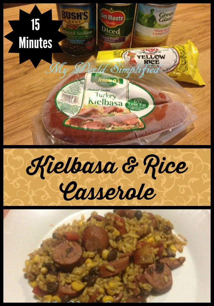 This is one of my “hamburger helper” type meals. Its fast and you can make it on that night you forgot to take something out. I always keep these ingredients in the cabinet anyway. I now make my black beans Recipe HERE and I usually use frozen corn. You can adjust it how you want. I usually start the rice and sausage at the same time and dinner is done in 20 minutes. An easy one skillet meal so little to clean up!